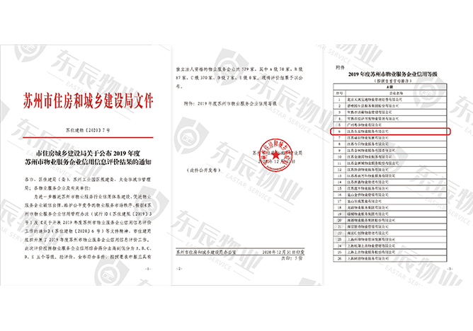 • 2019年度蘇州市物業服務企業信用等級A級